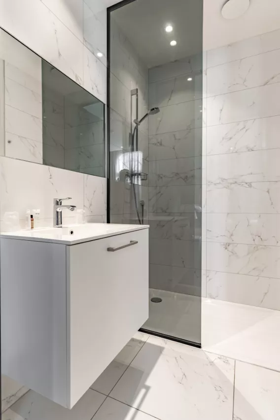Notre grand 2p. les chambres offrent encore plus de confort. Installez-vous dans un joli lit king-size moelleux ou profitez de la luxueuse salle de bains.